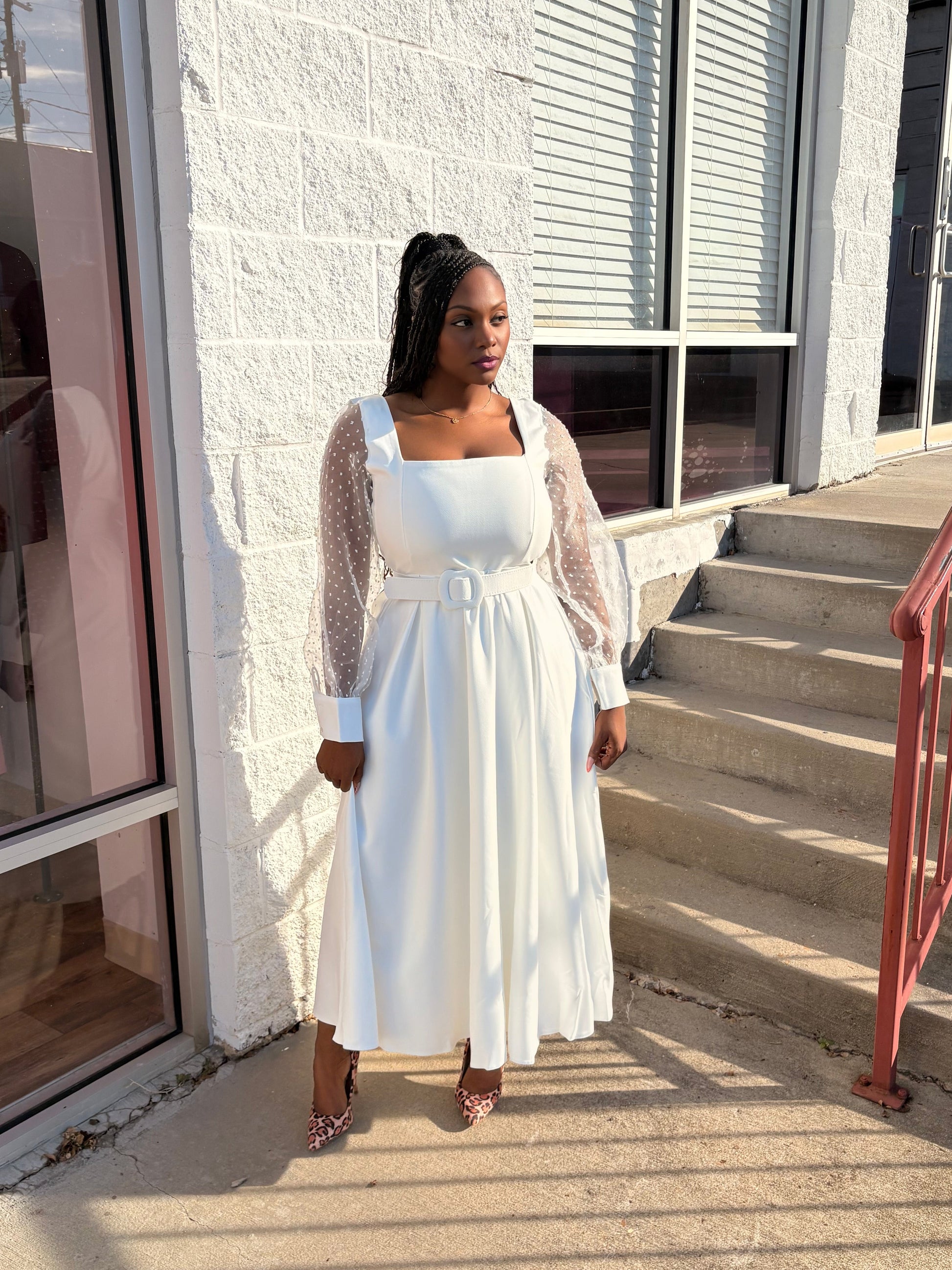 The Everlasting Dress combines a structured bodice and a square neckline for a sophisticated look, while sheer dotted sleeves introduce a contemporary element. The belted waist enhances the silhouette, making it an ideal choice for special occasions. This midi dress ensures an elegant profile that flatters a variety of body types.
