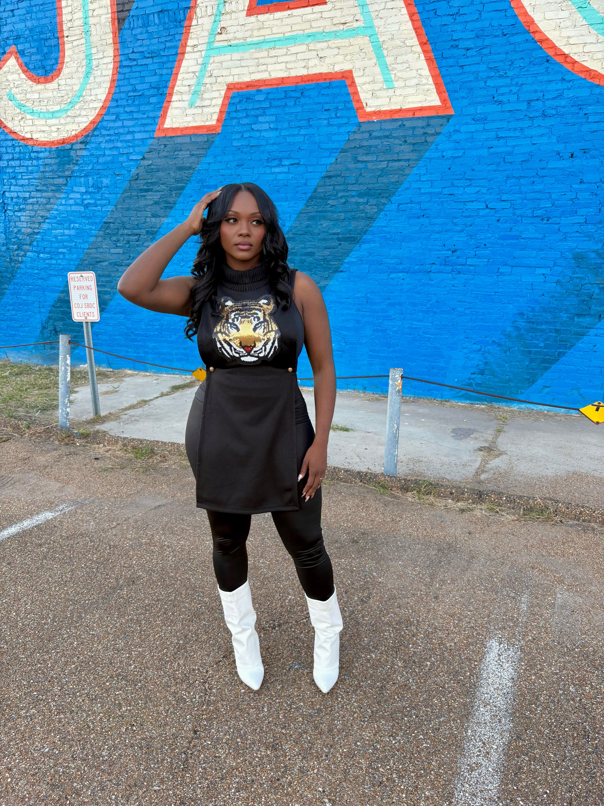 Sequins tiger head sleeveless sweater top. This too is very lightweight and the fabric is so breathable. Both sides are open and has a closure button. The neck is a turtleneck but can be worn up or folded down.