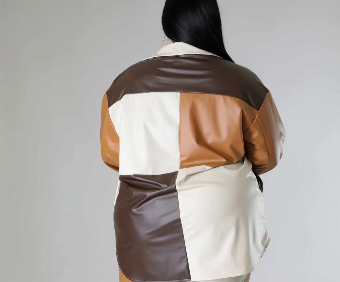 Enhance your wardrobe with the versatile WHISKEY Girl top. This multicolored button up top features a stylish collar, long sleeves, and convenient pockets. Made with faux leather, it can be worn open or closed for a variety of looks. The soft fabric blend of 70% polyester, 25% PU, and 5% spandex ensures comfort and style. Hand wash cold and dress it up or down for any occasion. Available in curvy sizes and modeled in a 2X.